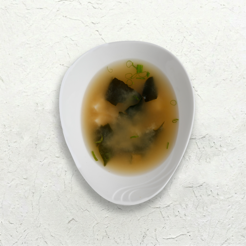 A warm and comforting traditional Japanese soup made with a rich, savory miso broth, wakame seaweed, and green onions. A perfect start to your meal, full of umami flavor.